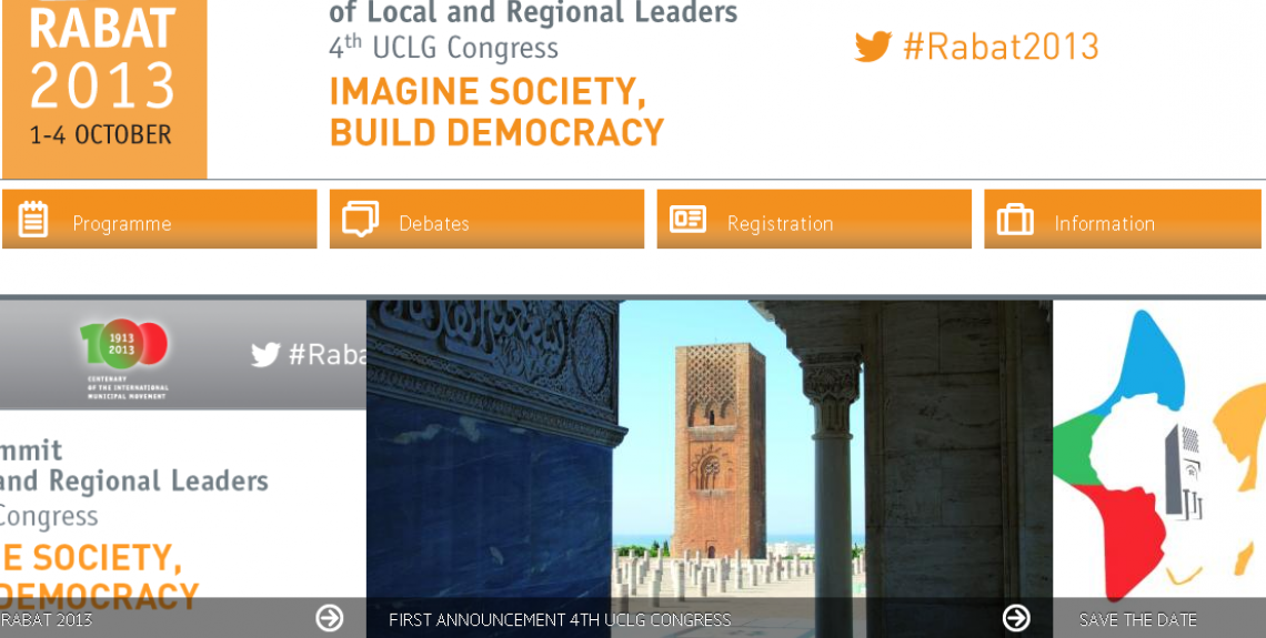 Today, United Cities and Local Governments (UCLG) launches the 'Rabat 2013' web platform for its World Summit of Local and Regional Leaders, to be held in Rabat, Morocco, this October. The platform www.uclg.org/Rabat2013 will provide information on the strategic and thematic debates of the Summit, and will function as a resource for the exchange of good practices. It will also allow representatives and partners of local and regional governments to follow the Summit live from 1-4 October 2013, and to participate in the activities of the global network. You will be able to directly access information on registration and your stay in Rabat during the Congress.