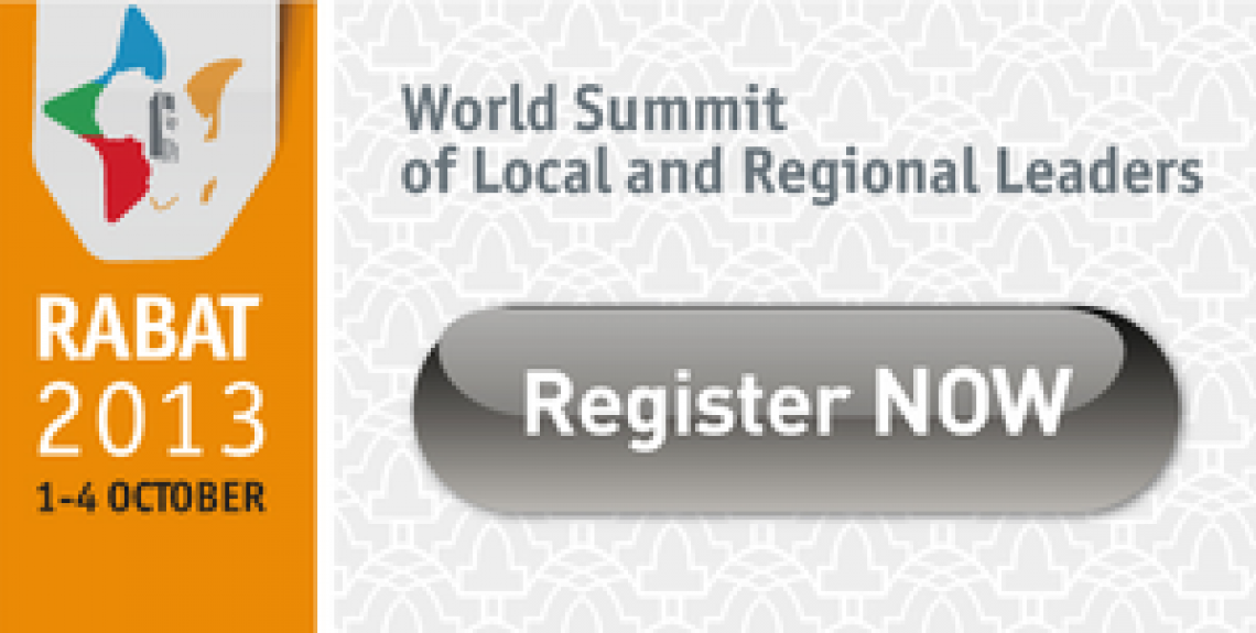 The World Summit is approaching. In around one month the World Summit of Local and Regional Leaders of United Cities and Local Governments (UCLG) will take place in the Moroccan capital Rabat from 1 to 4 October 2013. Rabat will be the setting for the biggest meeting of local and regional elected representatives the world over, with over 3000 participants from 100 countries. If you haven’t done it yet…Now is the time to register! The online registration closes on the 20th September. After this date, all registrations will have to be made upon direct presentation at the Summit.