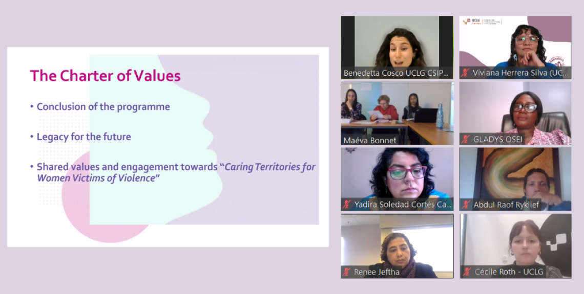 La Carta de Valores se encuentra en revisión a profundidad por las participantes y estará acompañada de herramientas de aprendizaje –fichas temáticas y un MOOC (Cursos online masivo y abierto)– dirigidas a los gobiernos locales y regionales comprometidos con la lucha contra la violencia hacia las mujeres.