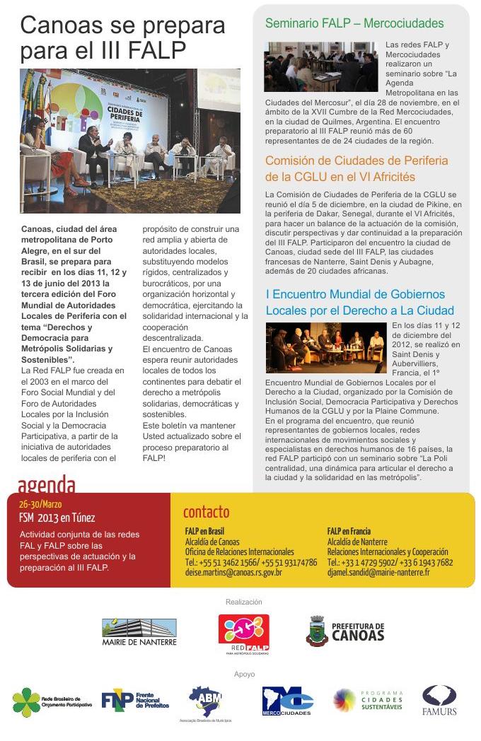 La ciudad de Canoas en Brasil acogerá los próximos 11, 12 y 13 de junio de 2013 el III Foro Mundial de Autoridades Locales de Periferia - FALP. El foro tendrá por tema: « Derechos y Democracias para unas Metrópolis Solidarias y Sostenibles ».