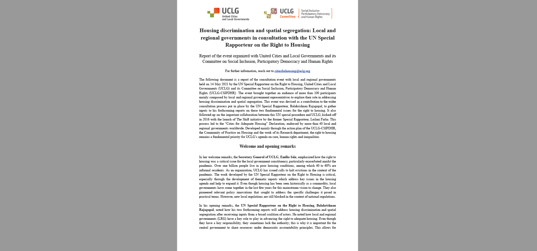 La consultation qui s'est tenue le 14 mai a réuni des représentants locaux et régionaux (GLR) et de la Communauté de pratique sur le logement de CGLU pour aborder la discrimination en matière de logement et la ségrégation spatiale. Cet événement a eu lieu dans le cadre du Bureau #UCLGMeets. Il a permis de relier les points de vue et les pratiques mis en place par les membres avec le processus de réflexion initié par le Rapporteur spécial de l'ONU Balakrishnan Rajagopal. Il s’agit, en effet, d’une question fondamentale pour la garantie locale des droits humains et de l'égalité urbaine. Cet exercice alimentera deux nouveaux rapports qui seront adoptés par l'ONU dans la période à venir (plus d'informations ici).