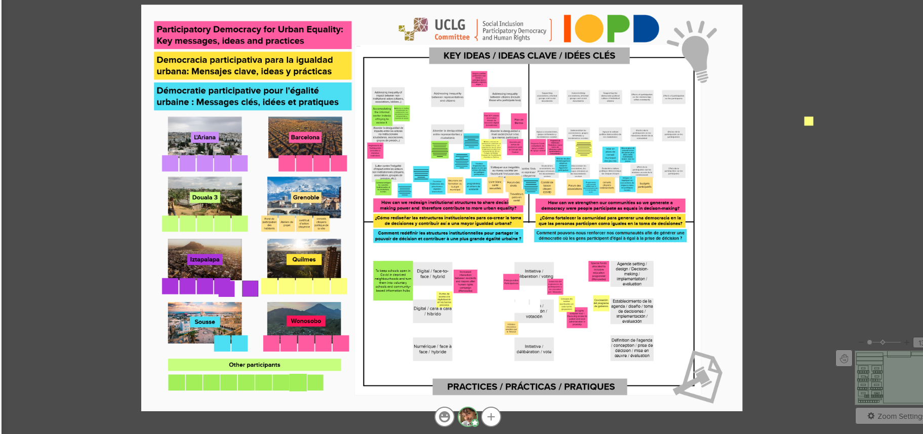 Par exemple, on a pu voir comment ils ont adopté une approche plus proactive et affirmative, en établissant des mécanismes de responsabilité cherchant plus de proximité et de liens directs avec les habitants ou en adoptant les technologies numériques. Même si la plupart des participants ont reconnu l’importance du rôle des technologies numériques dans le maintien des mécanismes de démocratie participative à l'heure de la pandémie, ils ont souligné que les espaces physiques de participation ne peuvent pas non plus être remplacés en raison de leur fonction sociale
