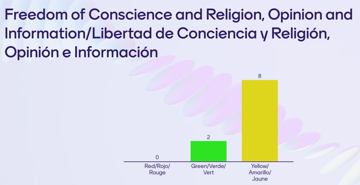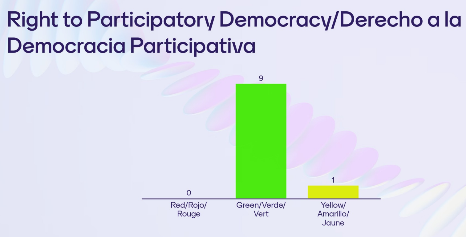 Lors de la première réunion, le comité de pilotage a évalué la pertinence actuelle de chaque article de la structure Charte-Agenda, par le biais d'une méthodologie de "feux de signalisation" dans Mentimeter, dans laquelle ils ont choisi entre la suppression (rouge), la modification (jaune) et le maintien (vert) de chaque article. Les résultats ont montré que le comité de pilotage ne considère pas qu'il soit nécessaire d'éliminer l'un des droits actuellement présents dans la Charte-Agenda, mais appelle plutôt à reformuler sept des douze droits et à laisser les cinq autres tels qu'ils sont formulés.