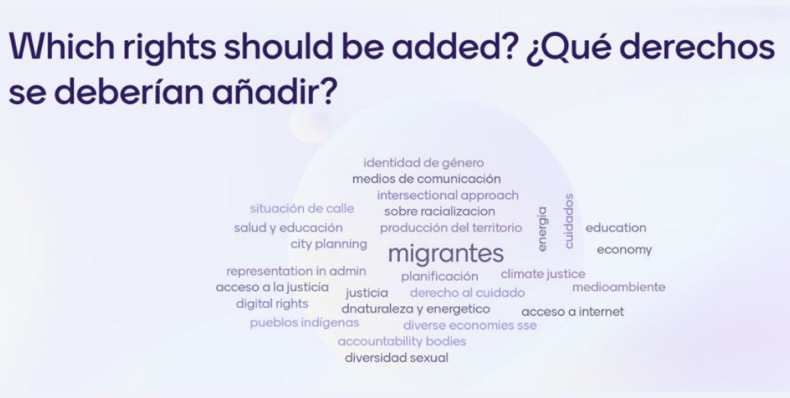 Suite à cette évaluation des droits déjà inclus dans la version actuelle de la Charte-Agenda, le comité de pilotage a été invité à réfléchir sur "Quels droits devraient être ajoutés ?" Les droits environnementaux, le droit à la justice, le droit au travail (avec un accent particulier sur l'informalité), le droit à la mobilité et au transport, le droit à la non-discrimination, le droit à une information impartiale, le droit à l'énergie et le droit à la santé ont été proposés. L'accent a également été mis sur l'introduction des concepts et sous-droits suivants dans le nouveau document : ville de plein droits, biens communs, la notion de soins (“caring” ou “cuidados”), intersectionnalité, justice raciale, économie, financement des villes, migrants et réfugiés, médias et communication, mémoire et culture de la paix, droits numériques. En outre, le comité de pilotage a souligné la nécessité d'élargir le concept d'accessibilité pour faire la distinction entre l'inclusion et la proximité.