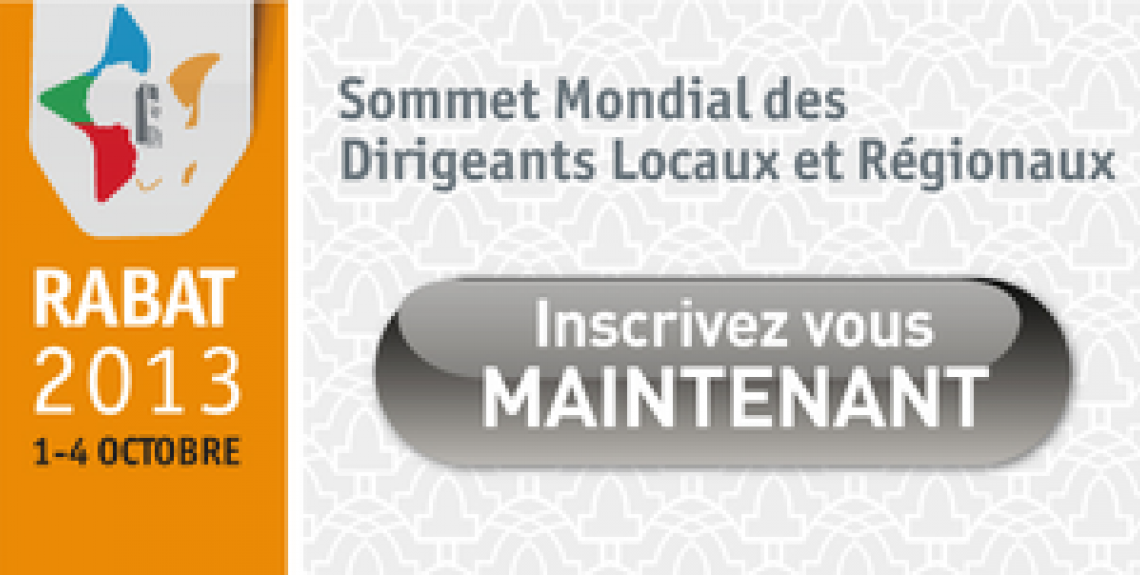 Dans près d’un mois, le Sommet Mondial des Dirigeants Locaux et Régionaux de Cités et Gouvernements Locaux Unis (CGLU) se tiendra dans la capitale du Maroc, Rabat, du 1er au 4 octobre 2013. Ce Sommet sera le plus grand rassemblement d’élus locaux et régionaux du monde, avec plus de 3000 participants de 100 pays. Si vous n’êtes pas encore inscrit, c’est le moment! Les inscriptions en ligne ferment le 20 Septembre. Après cette date, toutes les inscriptions devront être faites directement sur le lieu du Sommet.